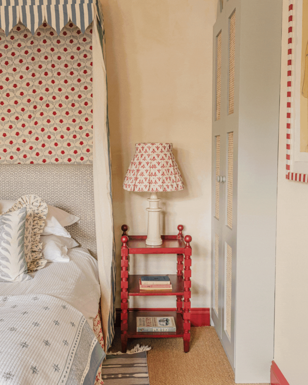 This bedroom features our Red Inverse Palm Grove Lampshade. Using the inverse pattern of the wallpaper is such an easy way to create an effortlessly layered space. We opted for red to tie in the stripes and the bedside table. This also offers some pattern variation. The Ivory Candlestick Lamp Base softens all the colour and again ties in the cream in the lampshade.
