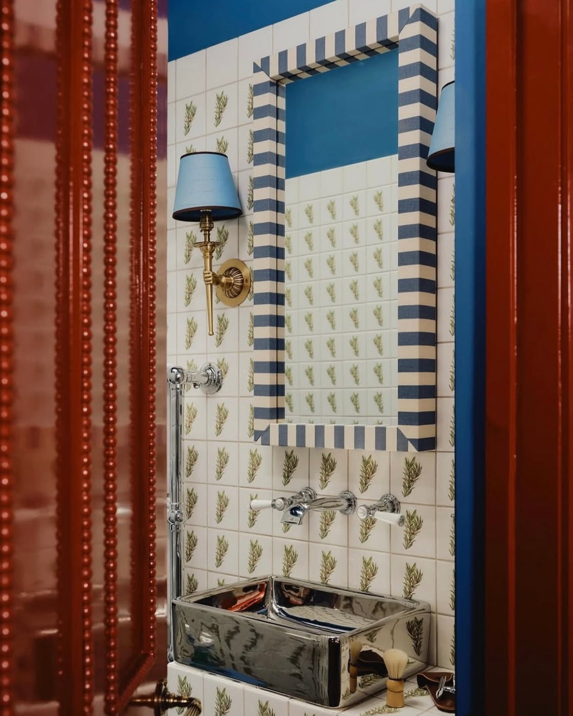 This loo at @thenetty features glossy reds, textural tile and an interesting mix of hardware. It's the perfect place for our Tangier Denim Stripe Mirror. Made to order for a unique pop of colour that fits any space.