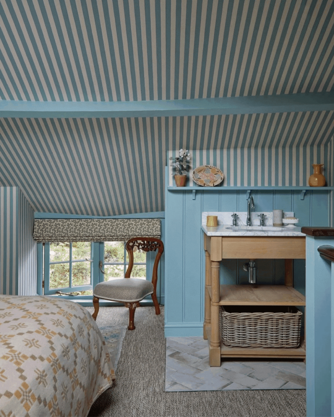 Our wallpapers bring character to any space. Using them on walls and ceilings creates such a cosy cocooning effect whether you're adding in stripes, florals or playful pattern. Our Tangier Iceberg Stripe Wallpaper complements the blue woodwork in the country bedroom by @highfidelityhome so well and the use of our Okra Poppy/Petrol Wallpaper in a downstairs loo by @astrid_houssin is so chic.