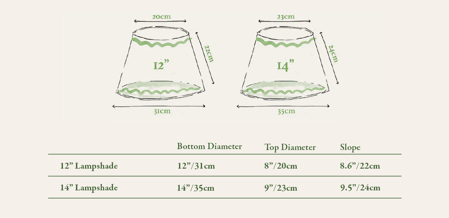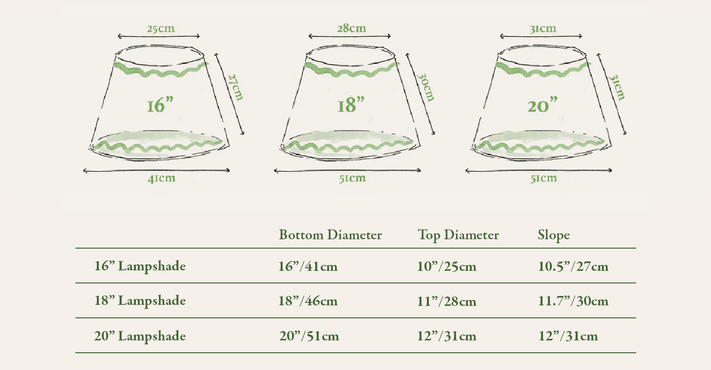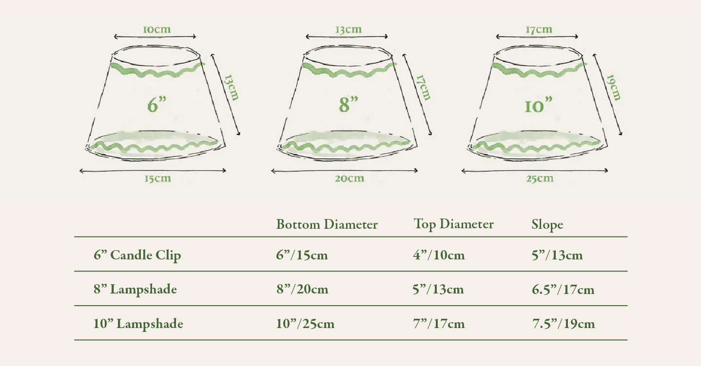 Welcome to our size guide, please see the below for all lampshade and bed valance measurements.