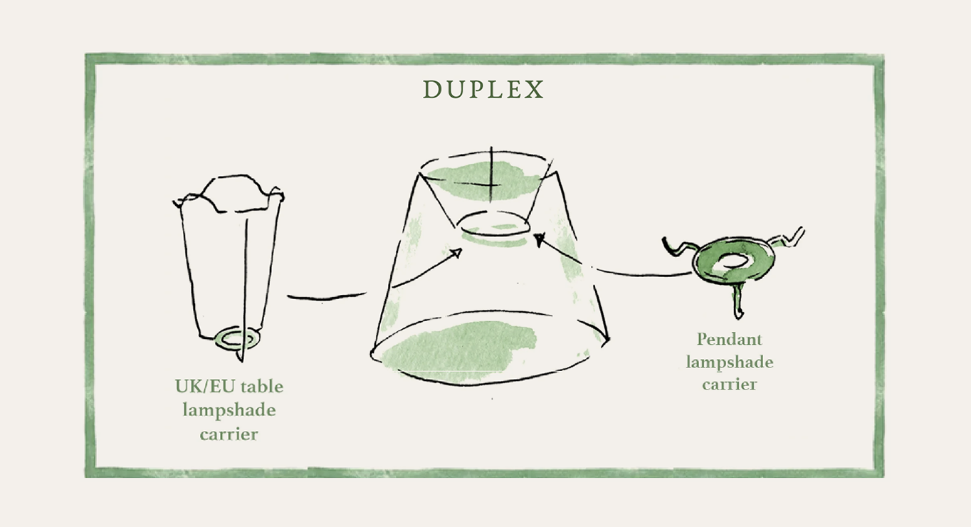 Duplex lampshade fittings come with all Alice Palmer lampshades with a base diameter of 14” or larger. We offer lampshade and pendant carriers to fit all UK, EU and US lamps.